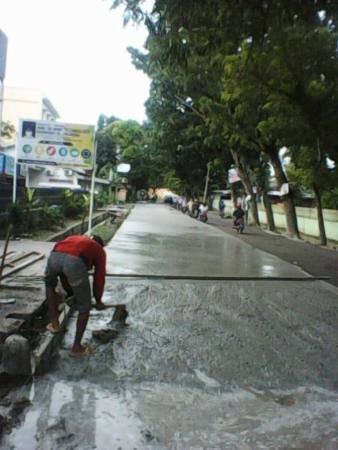 Berdasarkan amatan di lapangan, proses pembetonan berjalan dengan lancar. Sejumlah truk molen yang berisi coran tampak silih berganti menuangkan coran di atas pemukaan jalan rusak yang telah dimal dan dilengkapi dengan tikar besi sehingga pembetonan semakin lebih kuat.