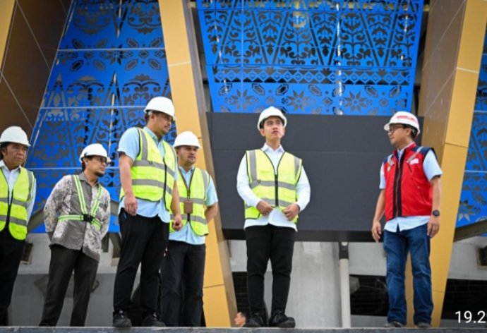 Setelah mendengar penjelasan tersebut, Wapres bersama rombongan pun memasuki bangunan masjid besar dan megah yang hampir rampung itu. Gibran memperhatikan dengan saksama hasil sementara pekerjaan tersebut.