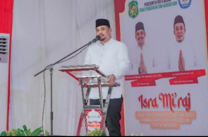 Hal ini disampaikan Wali kota Medan Bobby Nasution saat menghadiri Peringatan Isra Miraj yang digelar Pemko Medan melalui Dinas Pendidikan dan Kebudayaan Kota Medan di Lapangan rengas Pulau, kecamatan Medan Marelan, Selasa (14/3/2023). Sekitar 4.000 jemaah menghadiri peringatan yang digelar dalam rangka menyambut datangnya Bulan Suci Ramadhan 1444 H.