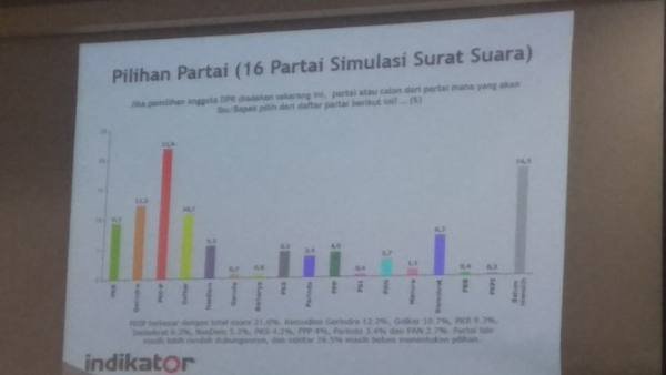 “PDIP terbesar dengan total suara 21,6 persen, kemudian Gerindra 12,2 persen, Golkar 10,7 persen, PKB 9,3 persen, Demokrat 6,3 persen, NasDem 5,3 persen, PKS 4,2 persen, PPP 4 persen, Perindo 3,4 persen dan PAN 2,7 persen,” kata Rizka di Kantor Lembaga penelitian Indikator Politik Indonesia, Jakarta Pusat, Rabu (23/4).