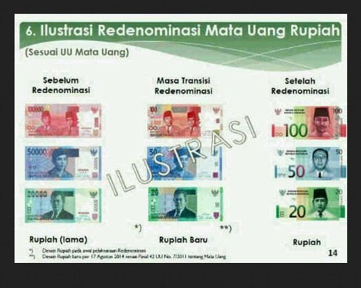 Perubahan harga rupiah ini pernah dijelaskan lengkap dalam kajian Bank Indonesia (BI). Redenominasi bukanlah sanering atau pemotongan daya beli masyarakat melalui pemotongan nilai uang.