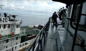 Video yang viral itu memperlihatkan kapal berbendera Vietnam dengan sengaja menabrakkan kapalnya itu ke KRI Tjiptadi-381. Kapal Vietnam itu berusaha menghalangi kapal TNI AL.