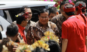 Denpasar, POL | Ketum Partai Gerindra Prabowo Subianto menghadiri Kongres V PDIP di Bali. Prabowo tiba didampingi elite partai, salah satunya Waketum Gerindra Sugiono.
