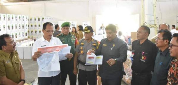 Dolok Sanggul, POL | Menjelang pemungutan suara pemilu serentak, Rabu 17 April mendatang, Forum Komunikasi Pimpinan Daerah (Forkopimda) Kabupaten Humbang Hasundutan (Humbahas) menninjau logistik Pemilu di gudang logistik KPUD Humbahas, Gedung Rindang, Dolok Sanggul, Selasa (9/4/2019).