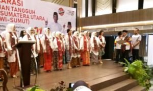 Medan, POL | Relawan pemenangan yang menamakan diri Perempuan Tangguh Pilih Jokowi (Pertiwi) Sumatera Utara mendeklarasikan dukungan mereka kepada calon presiden dan wakil presiden, Jokowi-Maruf Amin. Deklarasi ini ditandai dengan pengukuhan pengurus Pertiwi Sumatera Utara oleh Ketua Tim Kampanye Daerah (TKD) Jokowi-Maruf Amin Sumatera Utara di Hotel Polonia, Medan, Sabtu (16/11).
