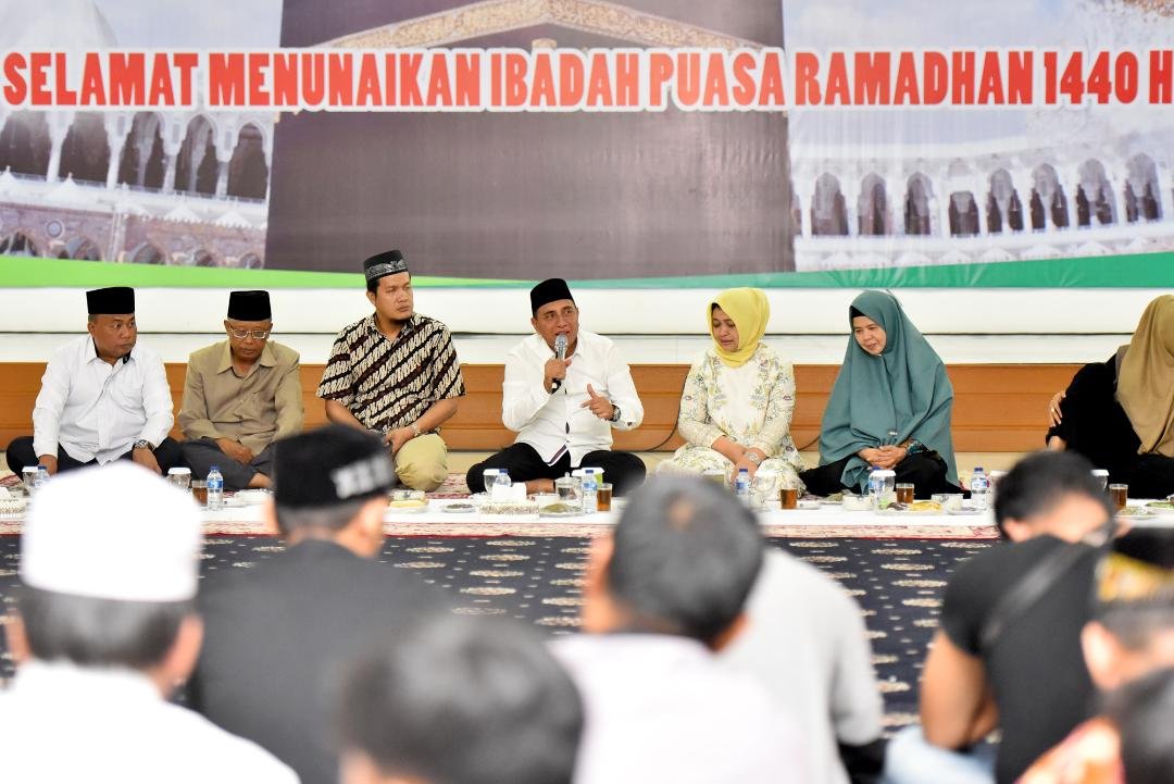 Medan, POL | Memasuki hari ke 15 Ramadan 1440 H, Gubernur Sumatera Utara (Sumut) Edy Rahmayadi berbuka bersama dengan penyandang disabilitas di Aula Rumah Dinas Gubernur Sumut Jalan Sudirman Nomor 41 Medan, Senin (20/5). Kepada para penyandang disabilitas, Gubernur menyampaikan bahwa bisa berkumpul bersama mereka merupakan kebagiaan bagi dirinya.