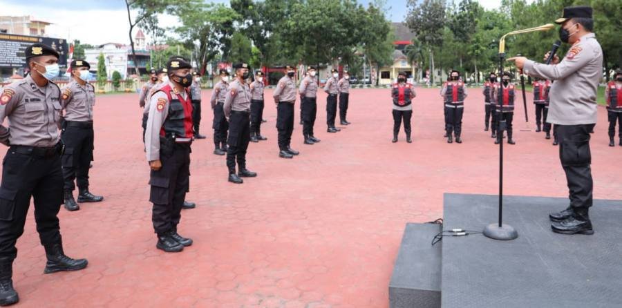 Medan, POL | Kapolda Sumut berikan arahan dan pembekalan kepada 76 Personel Polda Sumut yang BKO dalam rangka penanganan penyebaran Covid-19 di Kota Siantar, Selasa (10/08/21) Bertempat di Lapangan KS Tubun Polda Sumut.