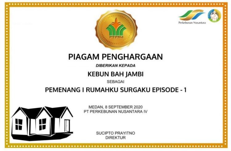 Medan, POL | Board of Management (BoM) PTPN IV, melalui program peningkatan rendemen minyak sawit tertinggi, program Problem Identification Corrective Action (PICA) untuk produktivitas TBS tertinggi dan program Rumahku – Surgaku, periode bulan Agustus 2020, memberikan penghargaan”, demikian dikatakan Direktur PTPN IV Sucipto Prayitno, pada Rabu 9 September 2020, di Kantor Direksi PTPN IV Jl. Letjen Suprapto No. 2 Medan.