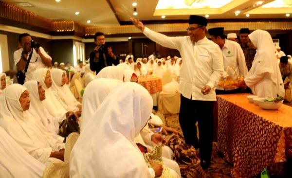 Medan, POL | Wakil Wali Kota Medan Ir H.Akhyar Nasution MSi menepungtawari calon jamaah (calhaj) haji asal Kota Medan di Hotel Emerald Garden, Sabtu (22/6/2019). Tepug tawar ini merupakan kegiatan rutin yang digelkar sebagai bentuk rasa syukur sekaligus doa restu kepada para calhaj sehingga nantinya dapat melaksanakan seluruh rukun ibadah haji dengan baik dan menjadi haji maupun hajjah yang mabrur.