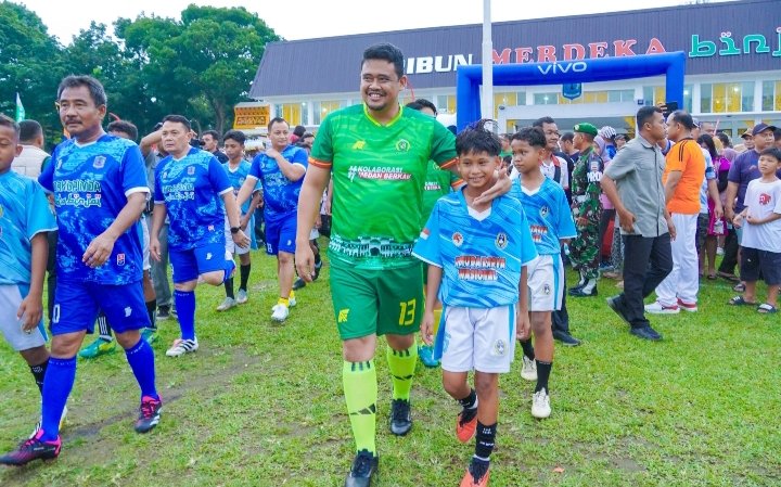 Binjai, POL | Keseruan mewarnai jalannya pertandingan friendly match sepakbola bertajuk ‘Silaturahmi Kolaborasi’ antara Forkopimda Kota Medan versus Forkopimda Kota Binjai di Lapangan Merdeka Binjai, Sabtu (7/9/2024) sore. Wali Kota Medan Bobby Nasution turun langsung sebagai kapten dengan mengenakan kostum nomor punggung 13.
