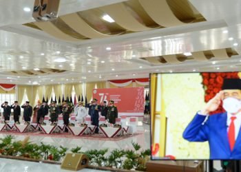 Medan, POL | Gubernur Sumatera Utara (Sumut) Edy Rahmayadi mengenakan pakaian adat Batak Toba saat mengikuti upacara penurunan Bendera Pusaka Merah ...