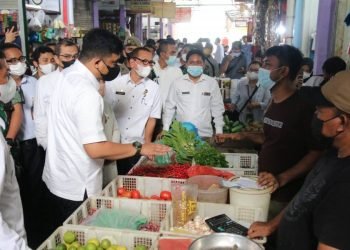 Medan, POL | Wali Kota Medan, Bobby Nasution melakukan peninjauan bahan kebutuhan pokok di pasar tradisional Sei Sikambing di Jalan ...