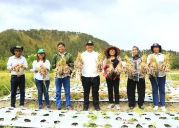selengkapnya>Samosir, POL | Bupati Samosir, Vandiko T. Gultom melakukan panen bawang merah bersama kelompok tani maju di Desa Aek Sipitudai, ...