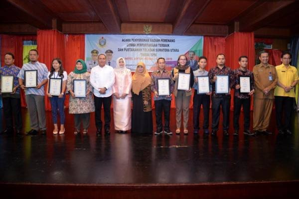 selengkapnya>Medan, POL | Gubernur Sumatera Utara (Gubsu) Edy Rahmayadi menyerahkan hadiah kepada pemenang Lomba Perpustakaan Terbaik dan Pustakawan Teladan Sumut ...