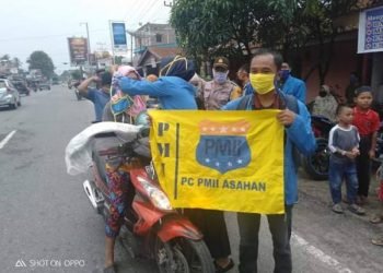 Asahan, POL | Persatuan Mahasiswa Islam Indonesia (PMII) bersama Sat Binmas Polres Asahan membagikan 100 nasi bungkus (Nasbung) dan 200 ...