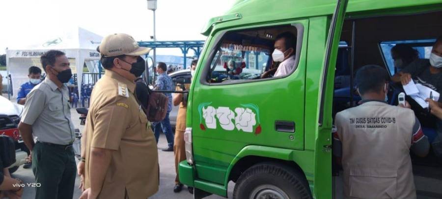 Bupati bersama rombongan meninjau kesiapan personil dan sarana prasarana pos penyekatan akses pintu masuk ke Samosir untuk membatasi dan memperketat pelaku perjalanan dari luar Samosir untuk menekan angka penyebaran Covid-19.