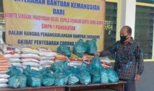 Labuhanbatu, POL | Komite sekolah bersama guru SMPN 1 Pangkatan kabupaten Labuhanbatu, Sumatera Utara, berbagi sembako kepada para pelajar yang terdampak Covid-19, di halaman sekolah SMP Negei 1 Pangkatan, Sabtu (8/5/2020).