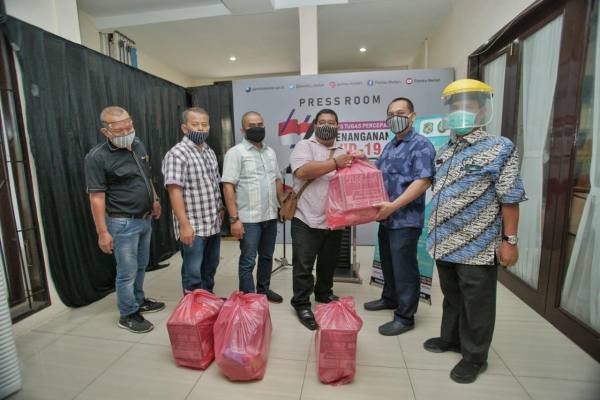 Bantuan diberikan Pelaksana tugas (Plt) Wali Kota Medan Ir H Akhyar Nasution MSi diwakili Kepala Badan Kepegawaian Daerah & Pengembangan Sumber Daya Manusia (BKD&PSDM) Kota Medan Muslim Harahap di Posko Gugus Tugas Percepatan Penanganan Covid-19 Kota Medan, Gedung Serbaguna Dharma Wanita, Jalan Rotan Medan, Kamis (11/6/2020). Sembako yang diberikan diterima secara simbolis Ketua Persatuan Wartawan Unit Pemko Medan M Edison Ginting SSos.