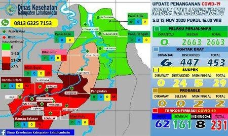 Kasi P2PM dr. Ibnu Hasyim mengatakan, update penanganan Covid-19 kabupaten Labuhanbatu hingga 13 November 2020 pukul 16.00 WIB, kasus kontak erat 453, kasus suspek 29, kasus probable 2 dan kasus konfirmasi positif Covid-19 sebanyak 231 orang.