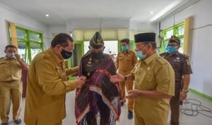 Padangsidimpuan, POL | Walikota Padangsidimpuan Irsan Efendi Nasution, SH dan Wakil Walikota Padangsidimpuan Ir. H. Arwin Siregar, MM sambut kedatangan Kepala Kejaksaan Negeri (Kejari) Padangsidimpuan yang baru Hendri Silitonga, SH. MH dengan mengulosinya.